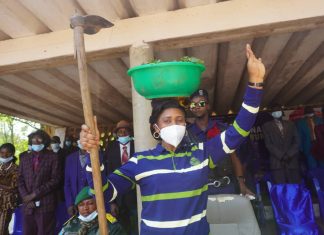 Houe à la main, produits champêtres sur la tête, Nathalie Ngandu commissaire général du gouvernement en charge des affaires sociales et Humanitaires,...